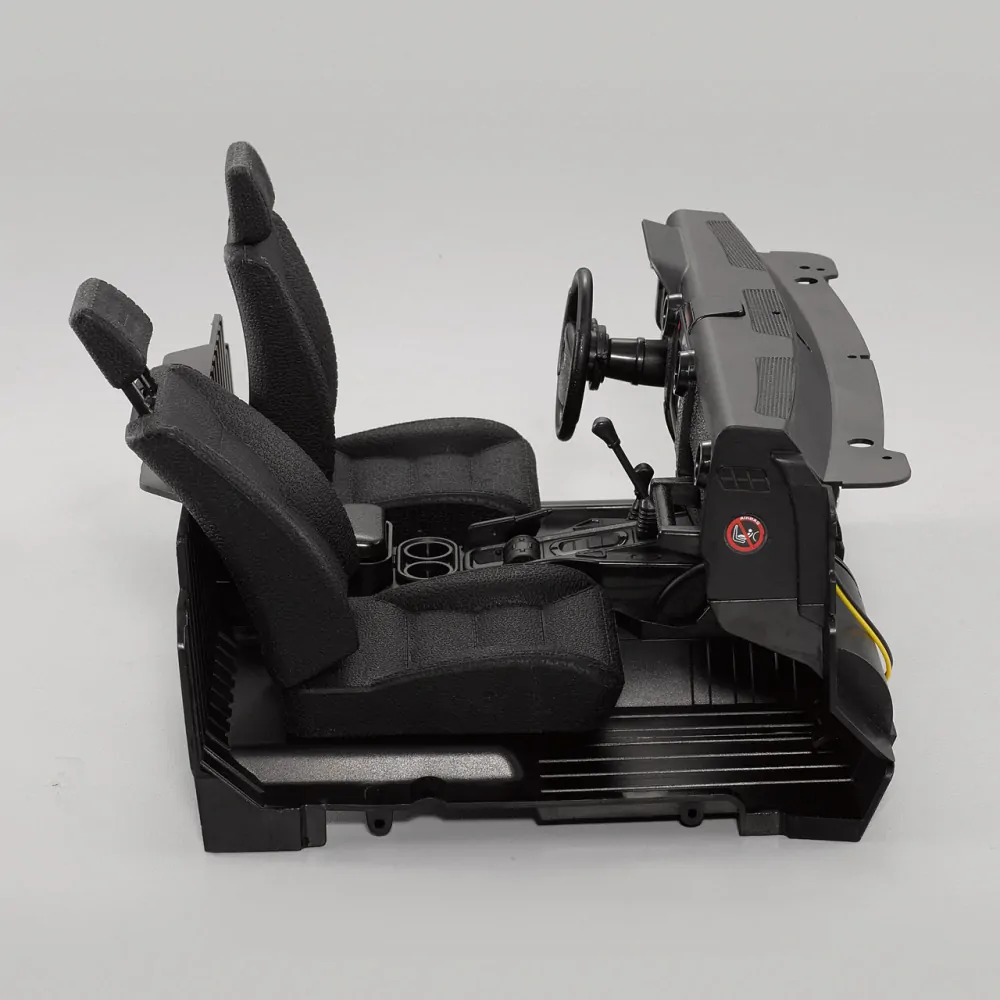 Sada kokpitu pro nástavbu Toyota LC70 s mnoha funkčními detaily. Sedadla lze posouvat a nastavit úhel opěradla, výškově nastavitelné jsou i opěrky hlavy. Kování je podsvícené a volant je pohyblivý a výškově i hloubkově nastavitelný. Mnoho drobných detailů jako páčky ruční brzdy, pedály atd. dotváří výborný celkový dojem.