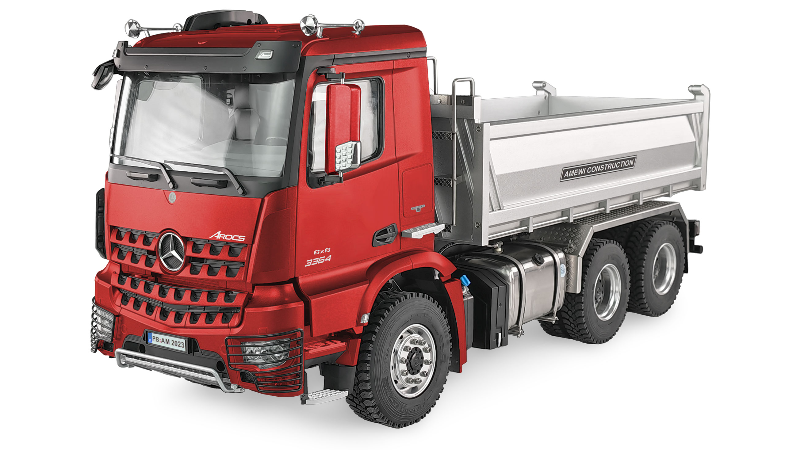 Exkluzivní licencovaný nákladní automobil z řady Mercedes-Benz Arocs, který zaujme jako model 6x6 s hydraulicky ovládanou funkcí sklápění a díky vzhledu v měřítku 1:14 zrychluje tep modelářů. Model je plně vybaven z kvalitní přepravní krabice a obsahuje všestranný bezstarostný balíček: Obsahuje kompletně sestavený model se zvukovým modulem, osvětlovací soustavou, pohonem 6x6, uzávěrkami diferenciálů, 2-rychlostní převodovkou, 5000mAh 2S Li-Ion baterie, 2,4GHz vysílací systém (plně naprogramovaný) a nabíječka. Součástí dodávky jsou také různé nástavce, jako je ochrana světlometů nebo atrapy signální houkačky, nářadí a hydraulický olej - a dokonce i baterie pro vysílač. Podvozek, nápravy, všechny díly pohonu a žlab jsou vyrobeny z kovu. Kabina je vyrobena z kvalitního plastu včetně prodloužení kabiny. Ráfky jsou vyrobeny z hliníku a pneumatiky jsou vyrobeny z profilované pryžové směsi pro maximální trakci v terénu. Jako tlumení nárazů celého podvozku slouží pevné odpružení listovými pružinami, které jízdní chování modelu velmi přibližuje originálu. Hydraulický sklápěč Arcos Pro díky vlastní váze 8,55 kilogramu zvládne i těžký terén.