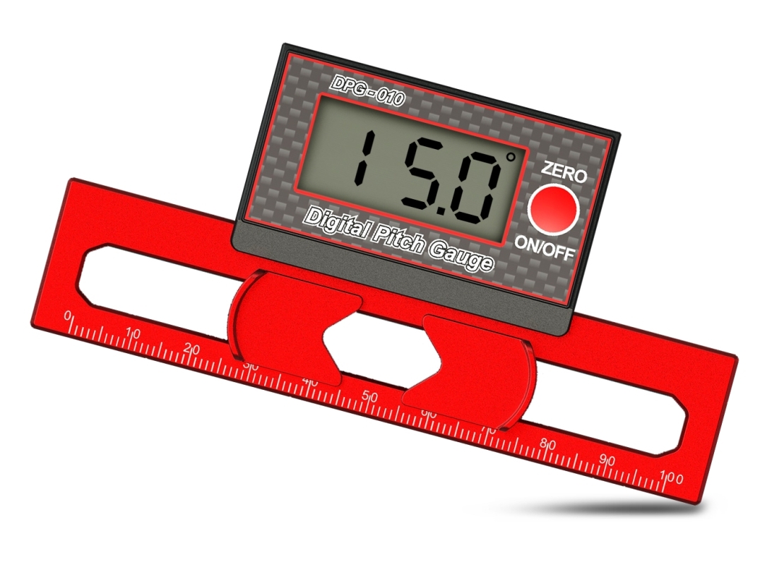 Měřič úhlu náběhu DPG-010 umožňuje měřit úhel náběhu lisů o hloubce 20-75 mm a tlouštce max. 10 mm. Jeho použití je samozřejmě mnohostrannější – jako vodováha a měřič úhlů v domácnosti, s jeho pomocí můžete „upgradovat“ třeba mechanický měřič úhlu náběhu pro letadla (např. oblíbený měřič Graupner #1030 EWD-Waage), měřit úhly vyosení motorů apod.