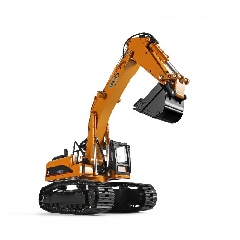 PROFESIONÁLNÍ pásový bagr v měřítku 1:16 s kovovými pásy a dalšími díly a otočí 360°. 2,4Ghz, zvukový, světelný a kouřový modul, 23 ovládacích kanálů