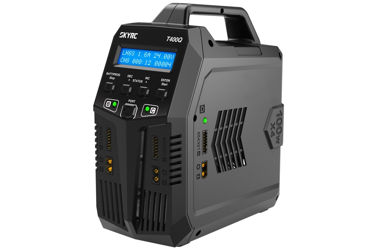 Čtyřkanálový nabíječ SKY RC T400Q 4x100W byl konstruován se snahou poskytnout vše potřebné pro nabíjení až čtyř akumulátorů současně „pod jednou střechou" včetně síťového zdroje a s jednoduchou obsluhou. Kompaktní „věžová“ skříňka zaručuje, že nabíječ vám na stole zabere mnimum místa. Na rozdíl od mnoha konkurenčních přístrojů má T400Q stejný výkon při napájení ze sítě i autobaterie, takže se můžete spolehnout, že vždy nabíjíte stejně rychle.